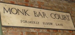 Situated on Monk Bar Court, which is a small lane off Goodramgate, the lane used to be known as Elbow Lane. In 1575 all householders in the city were required to keep the street in front of their properties clean and swept of dust, dirt, rubbish, animal droppings and anything else that stopped the road looking neat. These “sweepings” were taken to the nearest “midden”, which for the inhabitants of Monk ward at that time was in a garden in Elbow Lane owned by Thomas Barker. Today you can enjoy peace and quiet in this lovely little back lane without any risk of someone dumping their sweepings in your yard!