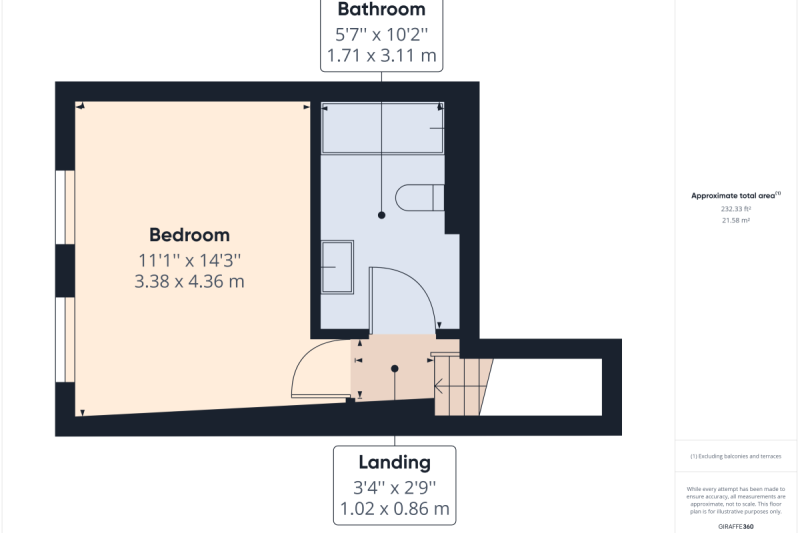 One bedroom with bathroom directly outside