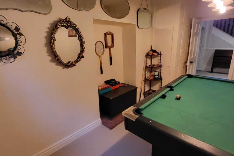 There is a large living room and a dark wood paneled dining room, a large kitchen with kitchen island and separate breakfast table – each of these rooms have amazing views which we have included in the images. Next to the kitchen is a separate utility room with washing machine and pantry storage. On the ground floor is a games room with a pool table and a toilet with shower unit.