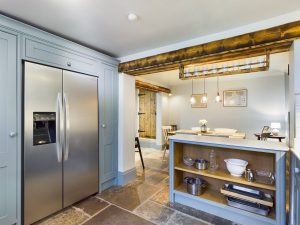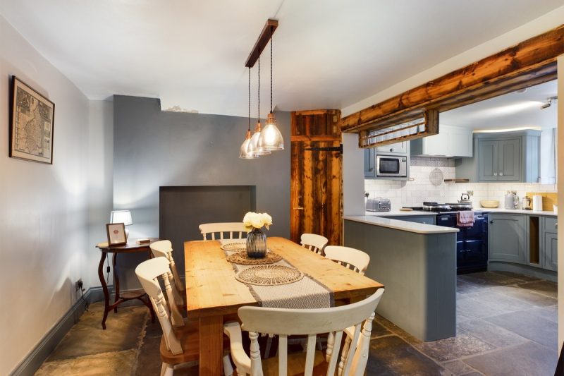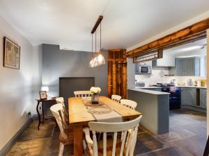 Open-plan kitchen and dining room with Aga, large fridge-freezer, dishwasher, microwave, kettle and toaster; seating for 6