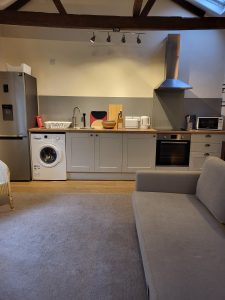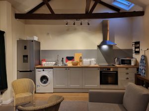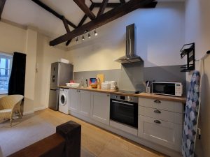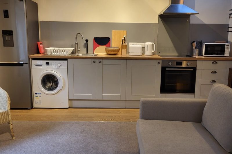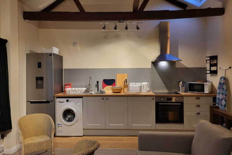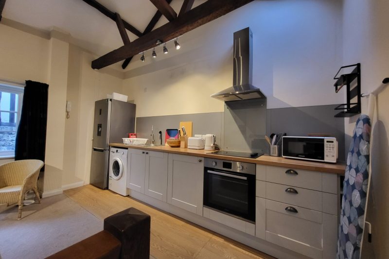Open-plan fitted kitchen with seating for two, equipped with toaster, kettle, electric hob and oven, washing machine and microwave